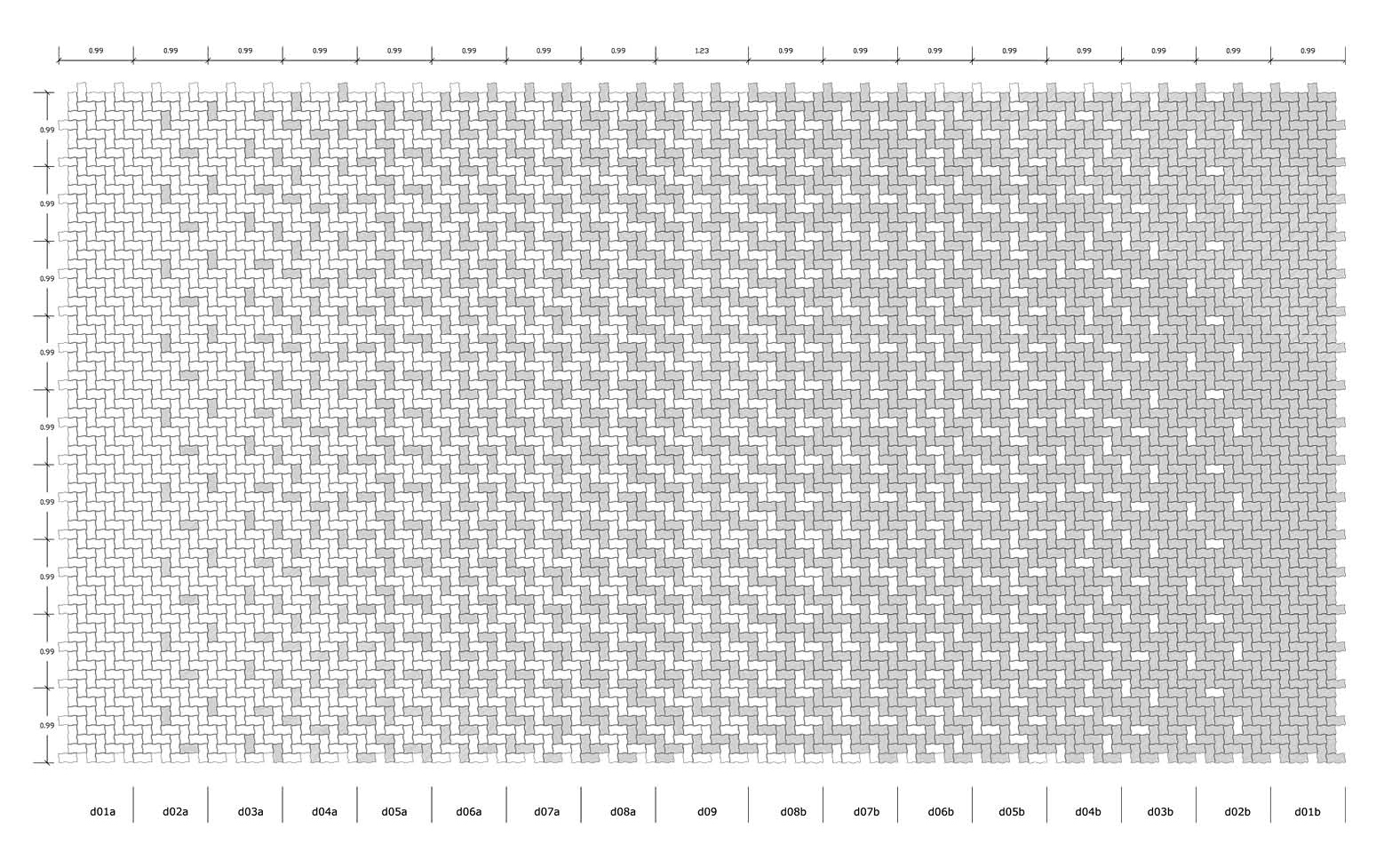 La extensión del proyecto es ambiciosa y abarca la totalidad del Bulevar de Sabana Grande, una de las pocas áreas públicas realmente peatonales de la ciudad, y todas las transversales perpendiculares a ella. Propusimos crear además una nueva plaza frente a la iglesia parroquial El Recreo para recuperar y formalizar lo que hoy es un espacio amorfo y difícilmente reconocible. Estas intervenciones suman aproximadamente 97.000 m2 de superficie pavimentada, diseñadas utilizando el mismo adoquín que existe hoy. El adoquín sinusoidal se ha convertido con el tiempo en parte de la memoria colectiva asociada con el boulevard y se celebra en el proyecto con un complejo y lúdico patrón de degradaciones entre gris y negro. Reutilizar los adoquines existentes también tiene el valor de dejar un proyecto precedente que contempla estrategias sostenibles de construcción en la ciudad.