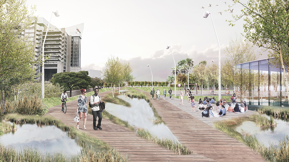 La relación con el río y las pendientes naturales del terreno permiten contemplar además un diseño de espacio público que se integra con la gestión del agua. Las calles están diseñadas con bioswales que son un sistema de recolección natural de aguas pluviales, que permite reducir el volumen de descarga en los colectores existentes y ayuda a reducir el riesgo de innundación sobre le río. También se reutiliza el agua pluvial para el riego de las zonas verdes propuestas.