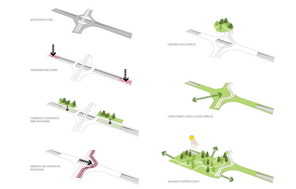 La propuesta para la transformación del entorno del Centro Cívico Medellín comprende 132 hectáreas de tejido urbano, con una cercana relación al Río Medellín. Las intervenciones de espacio público conectan con el eje del río, que será transformado en parque lineal. El espacio público también organiza y facilita mejores conexiones entre las diversas áreas del ámbito de intervención.
