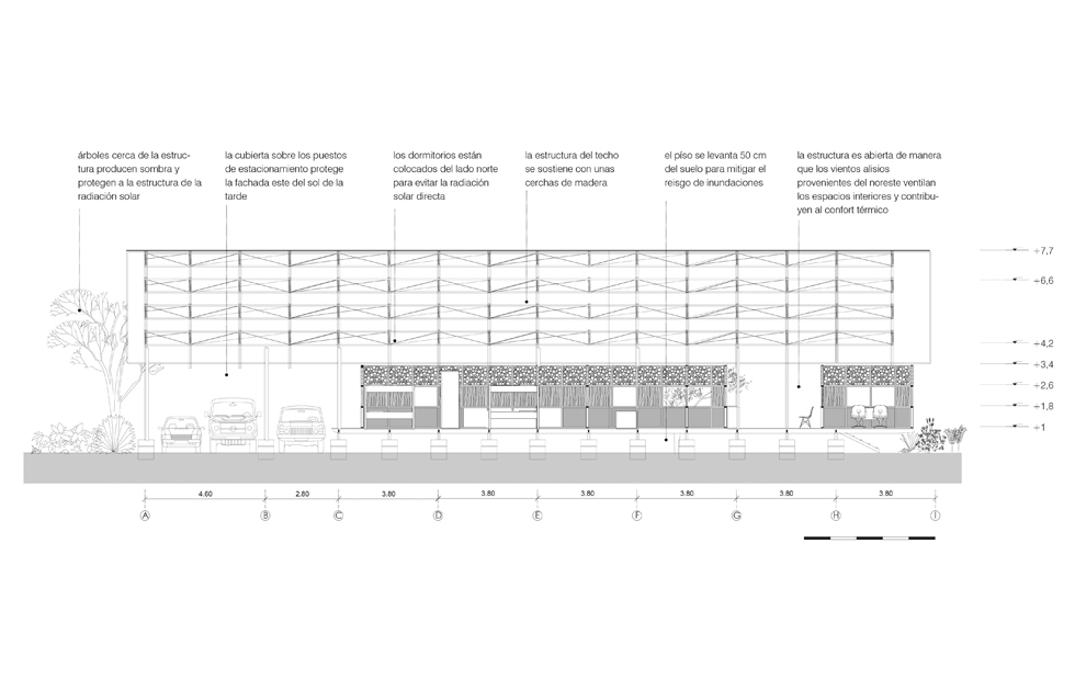 Cada uno de los módulos responde a las condiciones ambientales específicas de la zona. Por ejemplo en la zona costera el confort térmico se maximiza a través de la orientación de la estructura con respecto al sol y los vientos alisios y la implementación de paredes con aperturas que permiten crear una ventilación cruzada natural. En el caso de la selva el techo es alto y tiene una inclinación muy pronunciada para mitigar las fuertes lluvias típicas. El módulo de los llanos recoge los espacios en una planta tipo patio. Los techos altos permiten que el aire caliente suba y salga jalando el aire más fresco desde las zonas bajas que genera una conducción de aire al interior del proyecto.