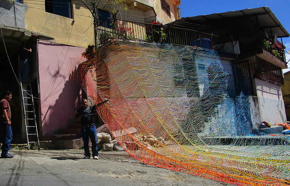 Este diciembre 2017 Enlace Arquitectura realizó una instalación de cubiertas en el barrio El Calvario del Municipio El Hatillo de Caracas con motivo del evento "El Calvario Puertas Abiertas" en su tercera edición. Consiste de una serie de siete cubiertas realizadas en mimbre sintético con diversas combinaciones de colores y tamaños que marcan el recorrido del asenso hasta la Plaza La Cruz donde se despliega la cubierta mayor. Esperamos estas piezas sigan acompañando la celebración decembrina y que convoquen a todos los caraqueños a acercarse al barrio, conocer la comunidad y disfrutar de las cubiertas.