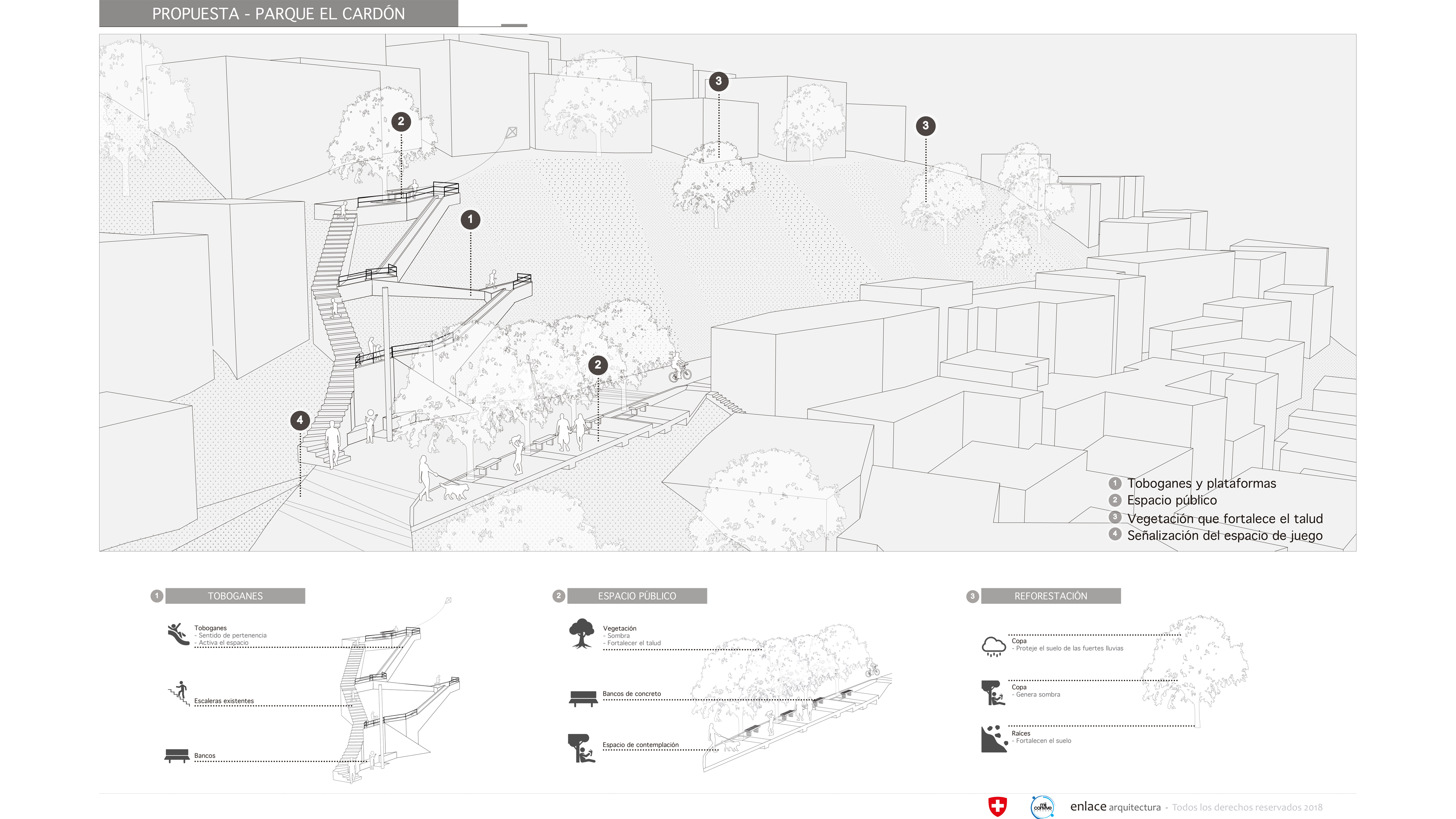 El Cardón es un asentamiento informal que forma parte de Antímano en el Municipio Libertador hacia el oeste de Caracas. Un comedor social operado a través del programa "Alimenta La Solidaridad" de la ONG Caracas MiConvive ha estado trabajando allí desde el 2017 al servicio de los niños del barrio que de otra manera no recibirían una comida balanceada todos los días. Los niños no tienen espacios donde jugar de manera segura en la comunidad, por lo que después de ver a tantos concentrados en el comedor, la comunidad pensó que sería bueno crear un parque infantil para ellos. La topografía es muy difícil, con grandes pendientes y escasos espacios abiertos disponibles para intervenciones en espacios públicos.